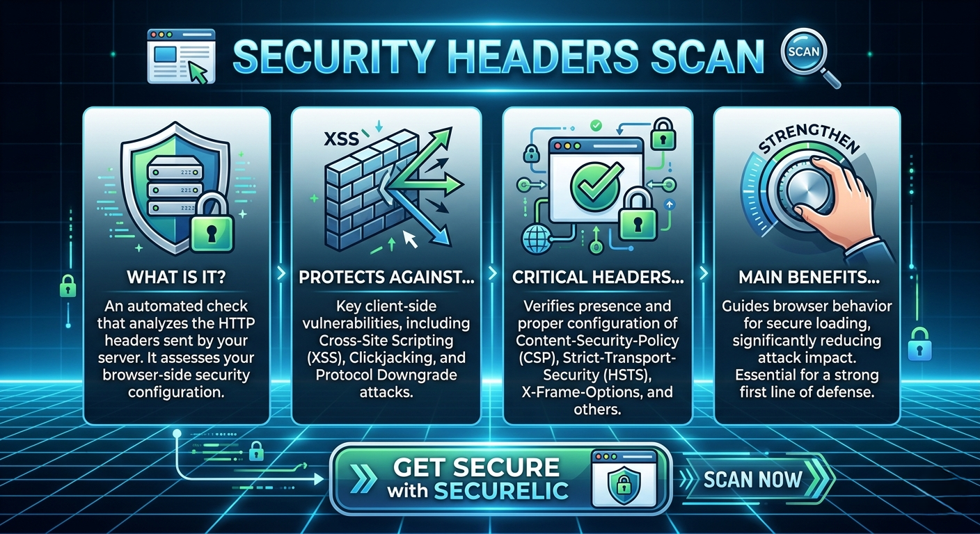 Don't wait for a client-side vulnerability to be exploited. Strengthen your browser-side security today. Run a comprehensive security headers scan with Securelic to instantly identify misconfigurations, enforce best practices, and achieve true peace of mind.